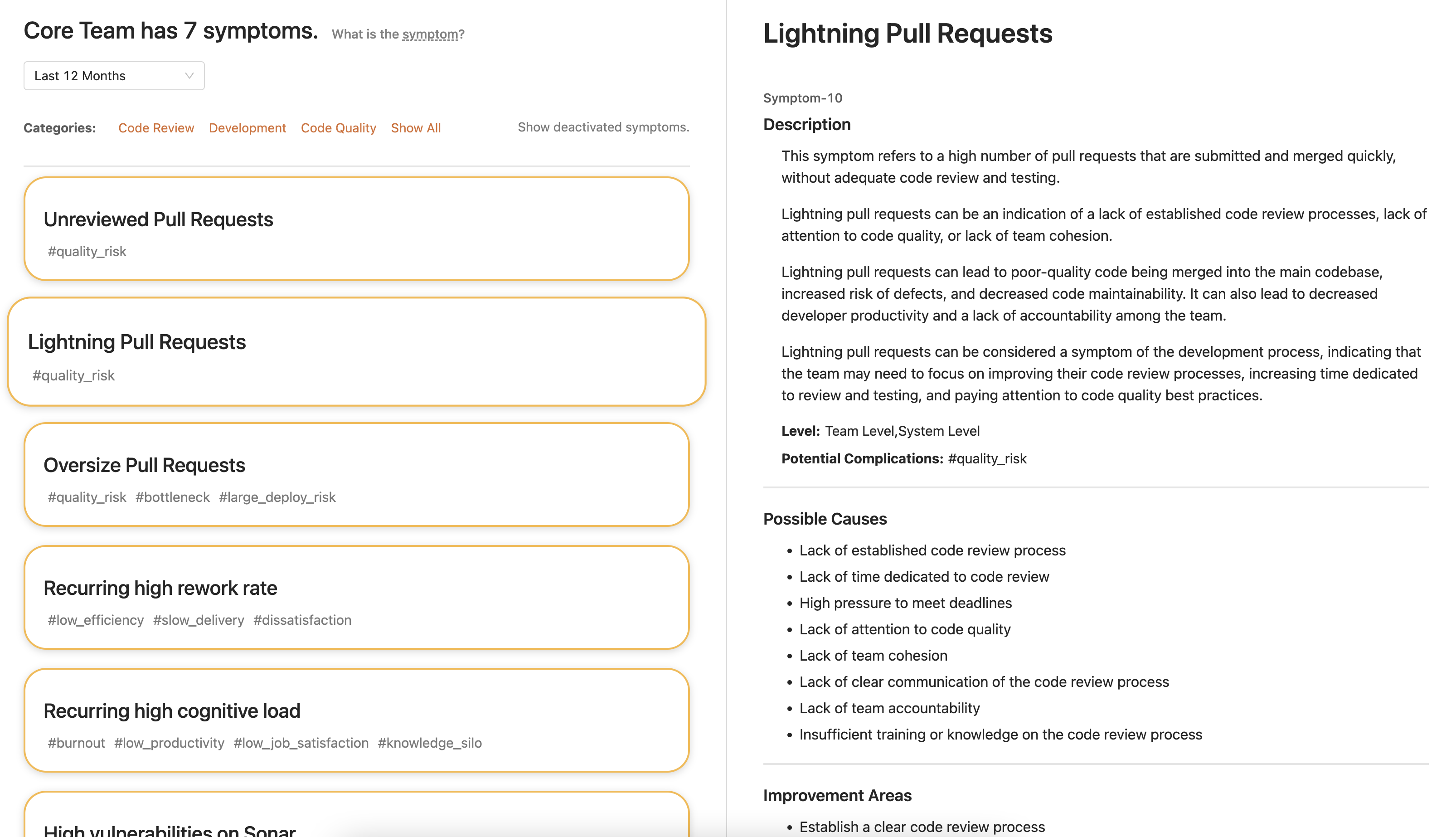 Symptoms are intelligent signals derived from your engineering data — highlighting code, process, or collaboration issues before they impact delivery.&#x20;